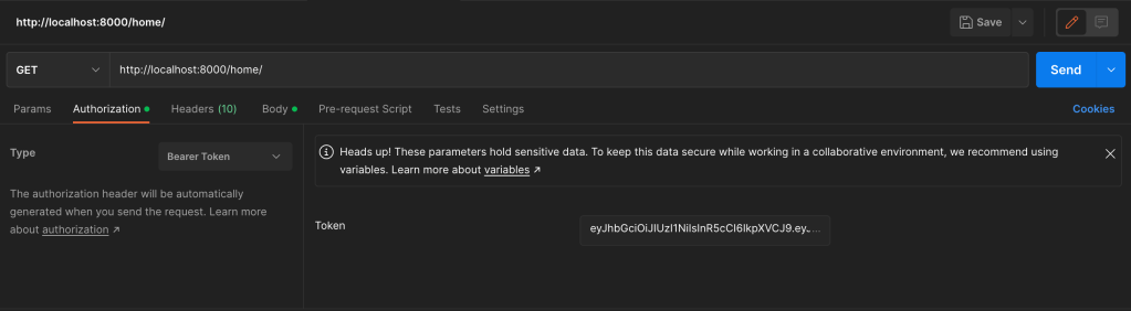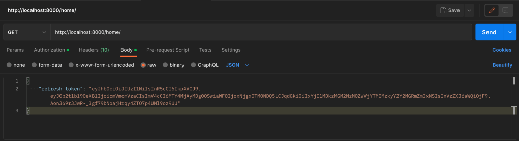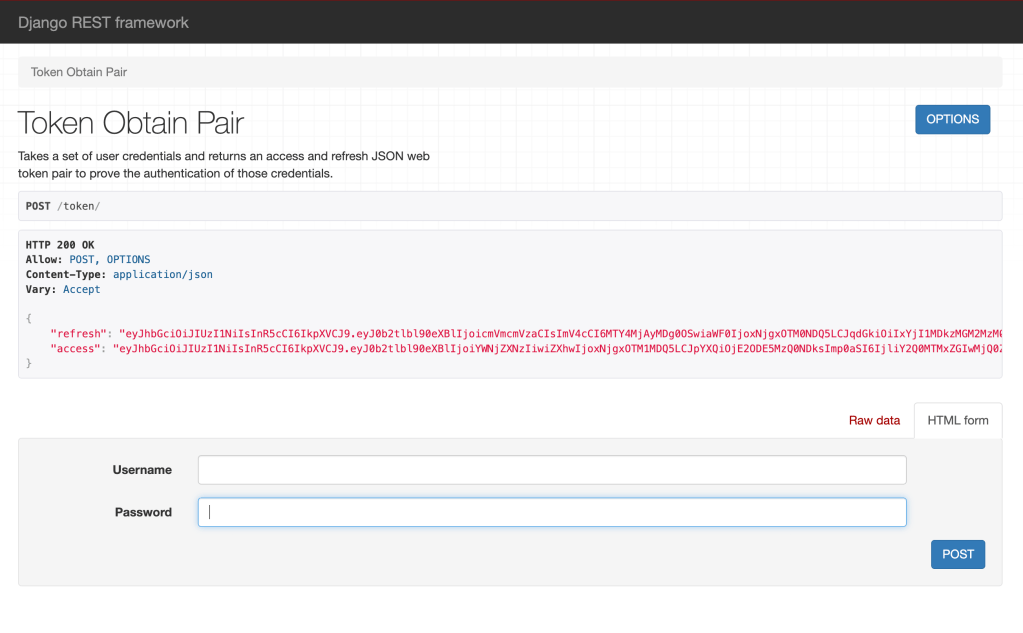 from django.urls import path from rest_framework_simplejwt.views import { TokenObtainPairView, TokenRefreshView } urlpatterns = [ path('token/', TokenObtainPairView.as_view(), name='token_obtain_pair'), path('token/refresh/', TokenRefreshView.as_view(), name='token_refresh'), ]After these steps, I created a superuser, and tested using a combination of the admin portal (localhost:8000/admin) and postman (to set headers, etc.):