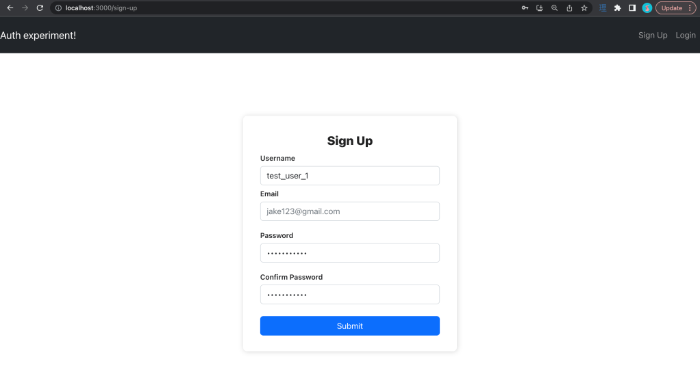 Signup form validation: as of this writing, I don’t currently have validation on the signup inputs (username, email, and password). There are many libraries that handle this, but this wasn’t in scope for me to get signup + authentication up and running (though, if I decide to work further on this project, I’ll most likely build that in form validation)