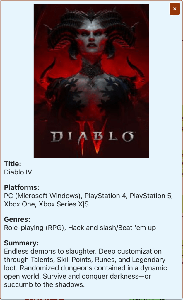 I’m then passing that list of games to a popover component and using the existing popper component to display detail information.