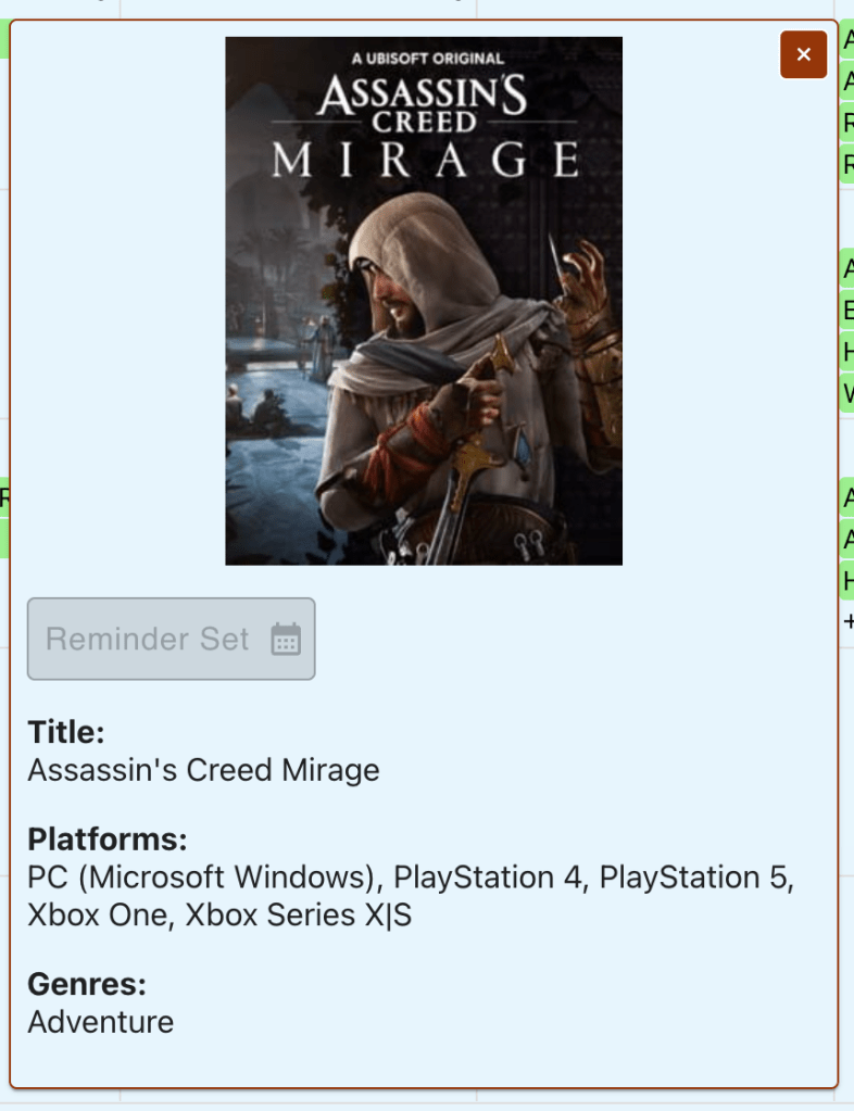 Recently, I’ve been working on detail cards for individual games. In other words, creating a way to more meaningfully engage with the list of titles presented in the calendar view. Here’s a snippet of it in action: