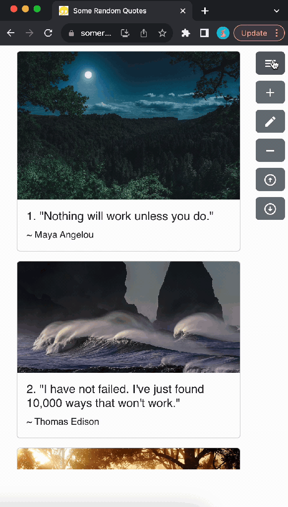 Right off the bat, there’s a visible difference between that first gif and the second gif. Namely, the list of actions appears on the right. I did this for 2 reasons, one, I wanted to prioritize displaying the quotes, and 2, I found it easier to see the actions condensed ‘into’ a hamburger icon on the right side.